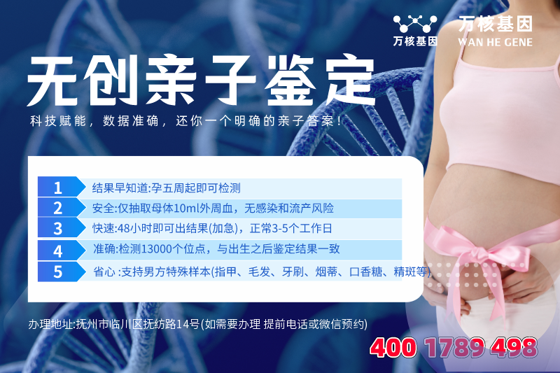抚州个人亲子鉴定办理地址:抚州市临川区抚纺路14号(如需要办理 提前电话或微信预约)-预约电话:4001789498,服务地区包括:临川区、东乡区、南城县、黎川县、南丰县、崇仁县、乐安县、宜黄县、金溪县、资溪县、广昌县等周边城市。